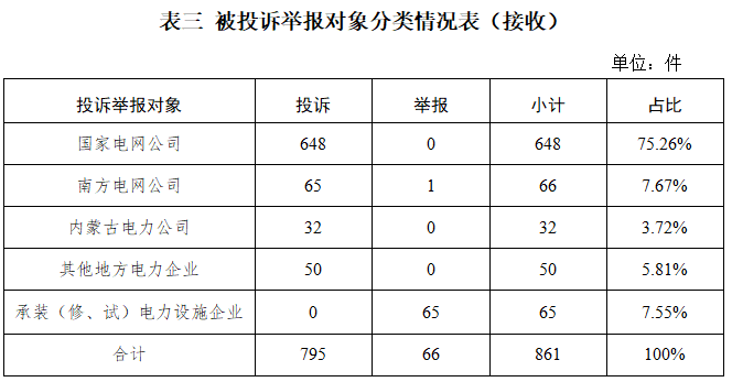 供电企业796件、占投诉举报总数的92.45%,其中国家电网公司648件、占投诉举报总数的75.26%,南方电网公司66件、占投诉举报总数的7.67%,内蒙古电力公司32件、占投诉举报总数的3.72%,其他地方电力企业50件、占投诉举报总数的5.81%;承装(修、试)电力设施企业65件、占投诉举报总数的7.55%。