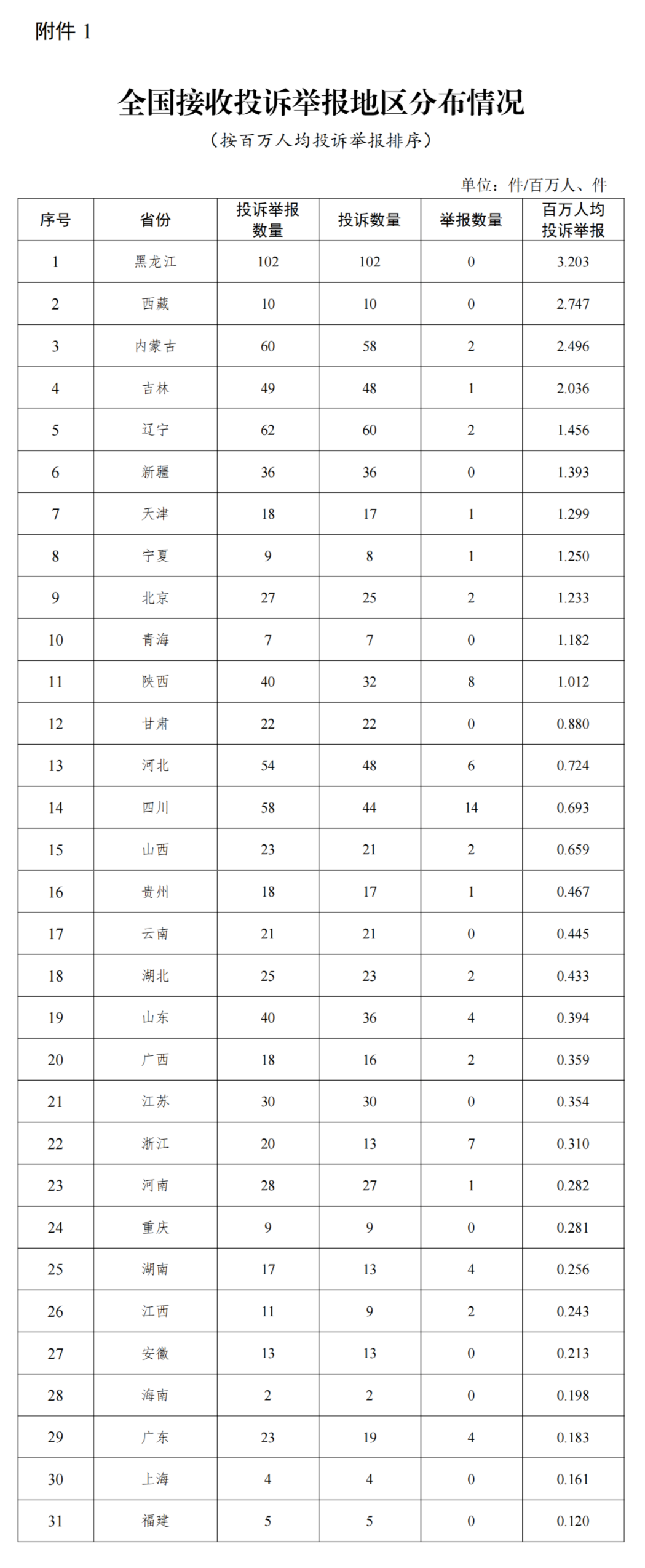 各省(自治区、直辖市)按照接收投诉举报数量排序,黑龙江、辽宁、内蒙古、四川、河北排在全国前5位。其中:按投诉数量排序,黑龙江、辽宁、内蒙古、河北、吉林排在全国前5位;按举报数量排序,四川、陕西、浙江、河北、广东(山东、湖南并列)排在全国前5位;按百万人均投诉举报数量排序,黑龙江、西藏、内蒙古、吉林、辽宁排在全国前5位。(全国接收投诉举报地区分布情况详见附件1)