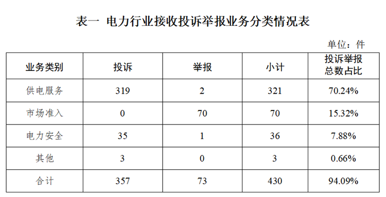 电力行业排在首位,数量为430件、占投诉举报总数的94.09%,主要集中在供电服务、市场准入、电力安全等方面。
