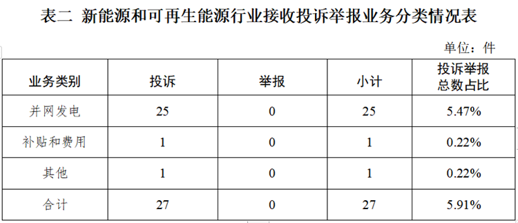 新能源和可再生能源行业排在第二位,数量为27件、占投诉举报总数的5.91%,主要集中在并网发电方面。
