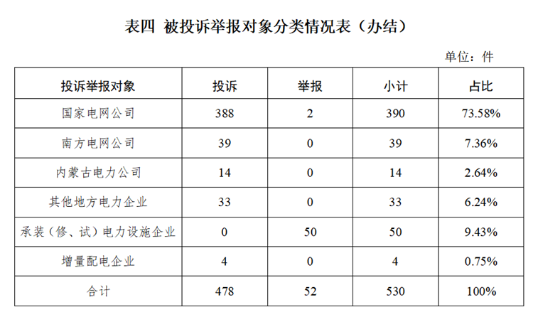 从被投诉举报对象看,供电企业476件、占投诉举报总数的89.82%,其中国家电网公司390件、占比73.58%;南方电网公司39件、占比7.36%;内蒙古电力公司14件、占比2.64%;其他地方电力企业33件、占比6.24%;承装(修、试)电力设施企业50件、占比9.43%;增量配电企业4件、占比0.75%。