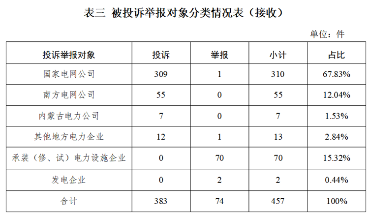 供电企业385件、占投诉举报总数的84.24%,其中国家电网公司310件、占投诉举报总数的67.83%,南方电网公司55件、占投诉举报总数的12.04%,内蒙古电力公司7件、占投诉举报总数的1.53%,其他地方电力企业13件、占投诉举报总数的2.84%;承装(修、试)电力设施企业70件、占投诉举报总数的15.32%;发电企业2件、占投诉举报总数的0.44%。