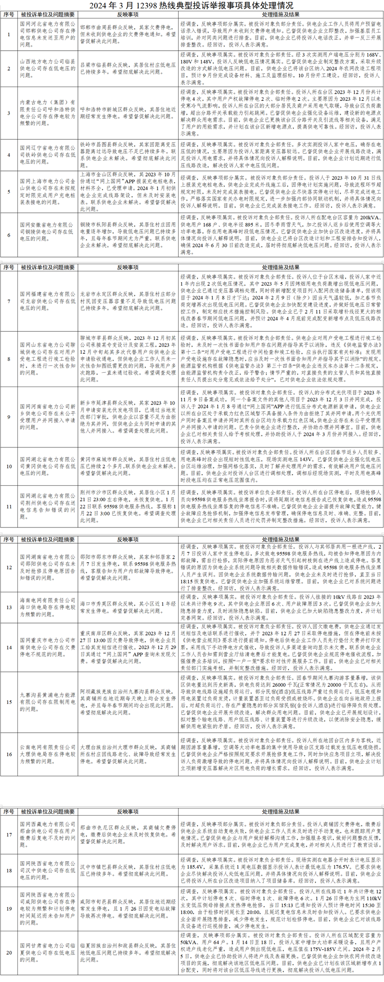 针对群众反映的投诉举报,国家能源局派出机构严格根据国家有关法规政策进行处理。一是督促供电企业加强台区等设备改造力度,缩短供电半径,提高电网转供、互供能力,有效解决故障停电、低电压等电能质量问题,进一步提升供电可靠性;二是要求供电企业加强设备隐患排查整治和停电抢修管理,加强线路巡视频次,及时消除隐患缺陷,增加抢修资源投入,提升设备管控和停电抢修能力,切实提高供电质量;三是通过行政处罚、监管约谈、责令整改等方式,纠正有关企业违法违规行为,维护公平公正的市场秩序和群众合法权益;四是通过解释说明、澄清事实,使群众消除误解。(2024年3月12398热线典型投诉举报事项具体处理情况,见附件2)