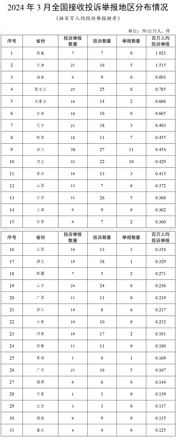 各省(自治区、直辖市)按照接收投诉举报数量排序,四川、河北、江苏、黑龙江、山东排在全国前5位。按百万人均投诉举报数量排序,西藏、天津、海南、黑龙江、内蒙古排在全国前5位。(2024年3月全国接收投诉举报地区分布情况,见附件1)