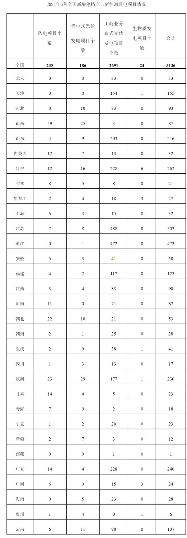 2024年6月,全国新增建档立卡新能源发电(不含户用光伏)项目共3136个,其中风电项目235个,光伏发电项目2877个(集中式光伏发电项目186个,工商业分布式光伏发电项目2691个),生物质发电项目24个。