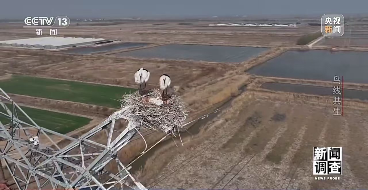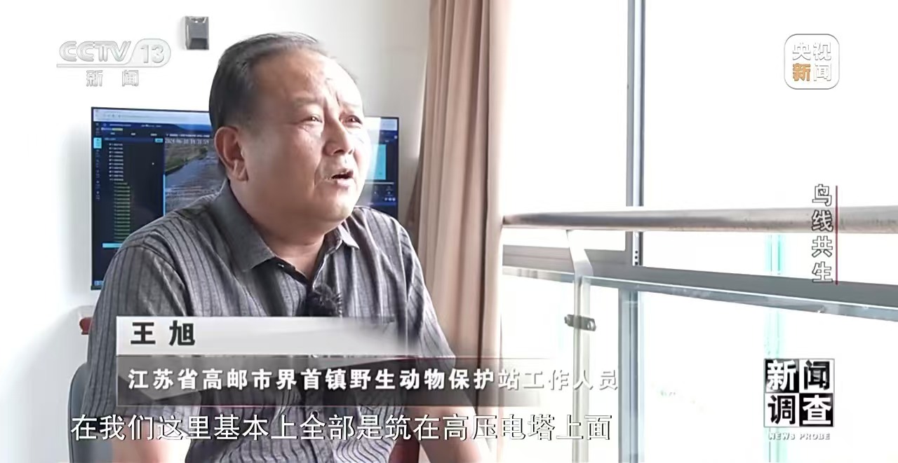 江苏省高邮市界首镇野生动物保护站工作人员 王旭:东方白鹳的巢在我们这里基本上是筑在高压电塔上面。电力部门有一支每天巡线的队伍,加上我们也要进行巡护,我们找到了一个共同点,成立了护线爱鸟志愿者服务队。