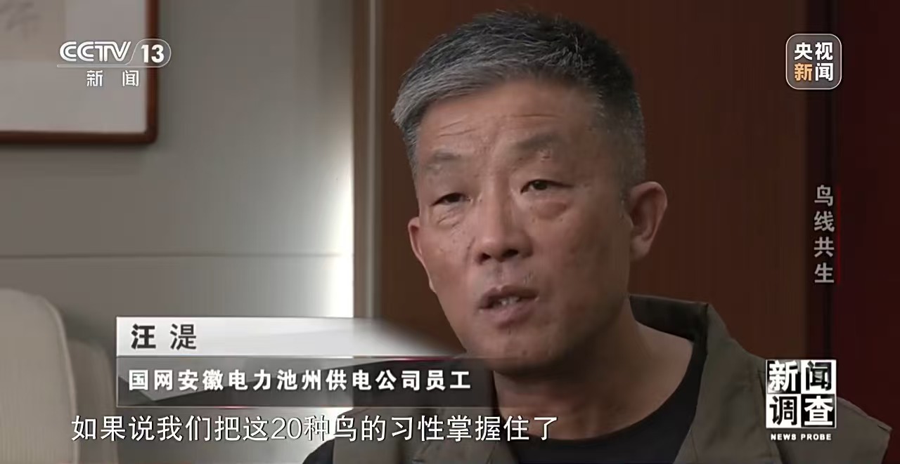 国网安徽电力池州供电公司员工 汪湜:我们要解决问题,所以逼着我们去学习鸟类的一些常识,要掌握它的习性。从我们目前了解情况,全中国一共是1448种鸟,与我们输电线路有直接联系的鸟类不超过20种。如果我们把这20种鸟的习性掌握住了,做适当防护,那就解决了这个问题。讲起来容易,实际上做起来很难。