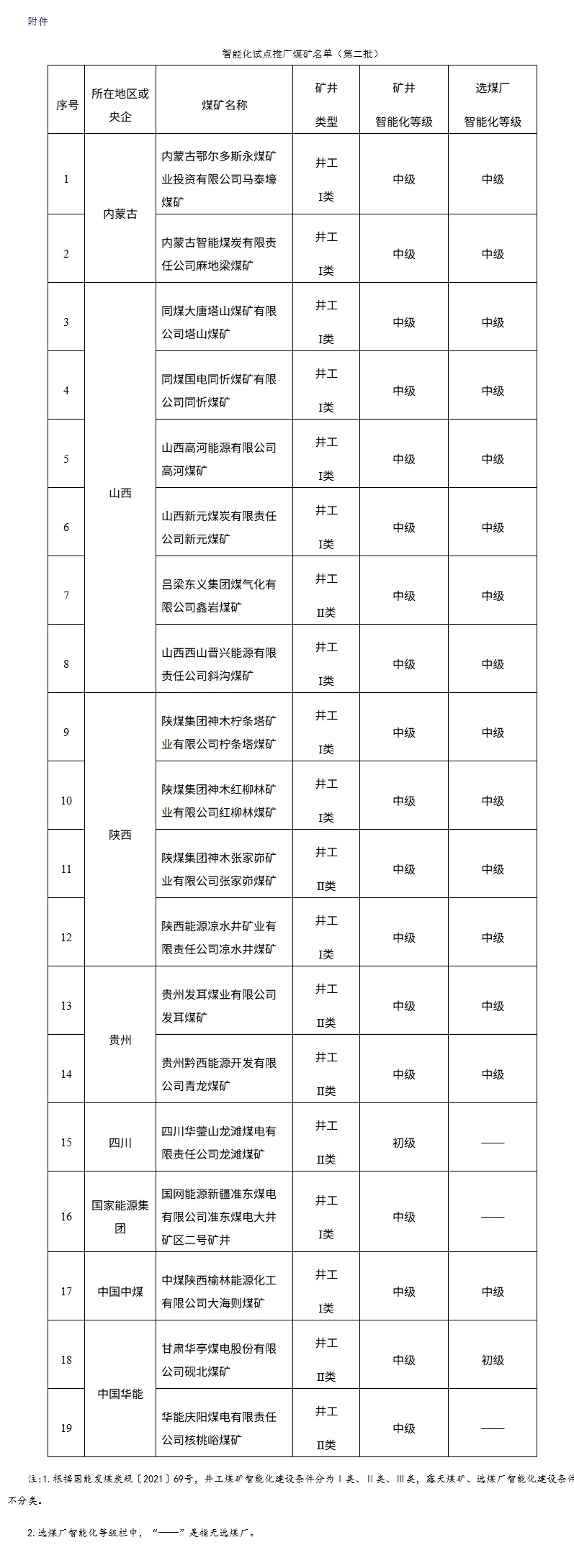 附件:智能化试点推广煤矿名单(第二批)
