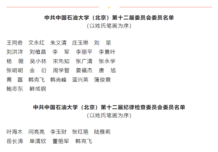 会议选举产生了中国共产党中国石油大学(北京)第十二届委员会常委、书记、副书记。王同奇当选为党委书记,吴小林、韩克飞、文永红、蒲俊霖当选为党委副书记。王同奇、吴小林、鲍志东、韩克飞、韩尚峰、金衍、文永红、刘植昌、张广清、蒲俊霖、刘坚、李丽平、黄磊当选为党委常委。