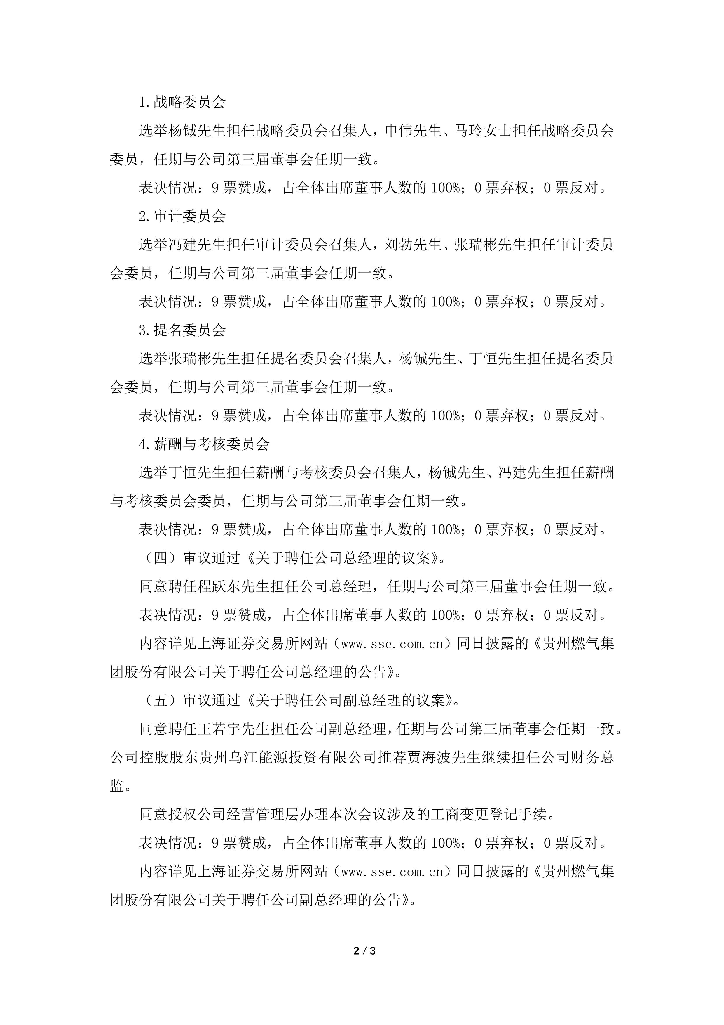 8月29日,贵州燃气集团股份有限公司召开第三届董事会第十次会议,会议审议通过《关于选举公司董事长的议案》和《关于聘任公司副总经理的议案》,选举杨铖担任公司第三届董事会董事长(法定代表人),同意聘任王若宇担任公司副总经理。