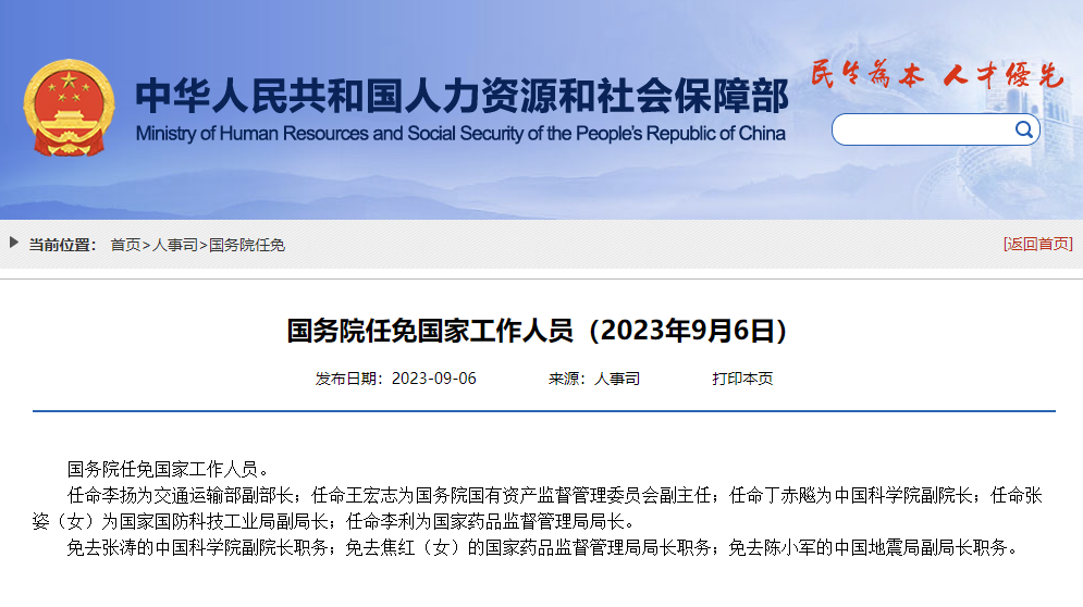 任命李扬为交通运输部副部长;任命王宏志为国务院国有资产监督管理委员会副主任;任命丁赤飚为中国科学院副院长;任命张姿(女)为国家国防科技工业局副局长;任命李利为国家药品监督管理局局长。