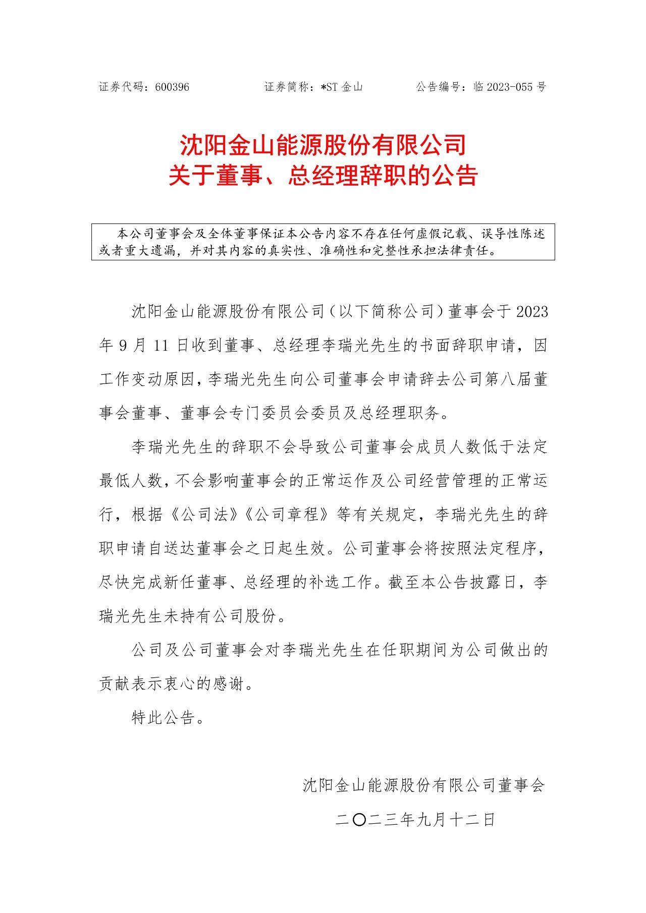 沈阳金山能源股份有限公司发布公告称,公司董事会于2023年9月11日收到董事、总经理李瑞光的书面辞职申请,因工作变动原因,李瑞光向公司董事会申请辞去公司第八届董事会董事、董事会专门委员会委员及总经理职务。
