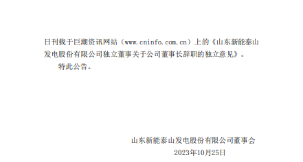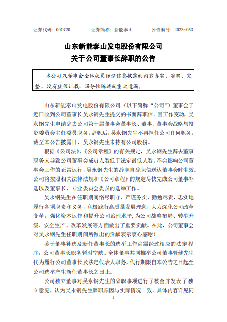 山东新能泰山发电股份有限公司董事会于近日收到公司董事长吴永钢提交的书面辞职信。因工作变动,吴永钢申请辞去公司第十届董事会董事长、董事、董事会战略与投资委员会主任委员职务。辞职后,吴永钢不再担任公司任何职务。
