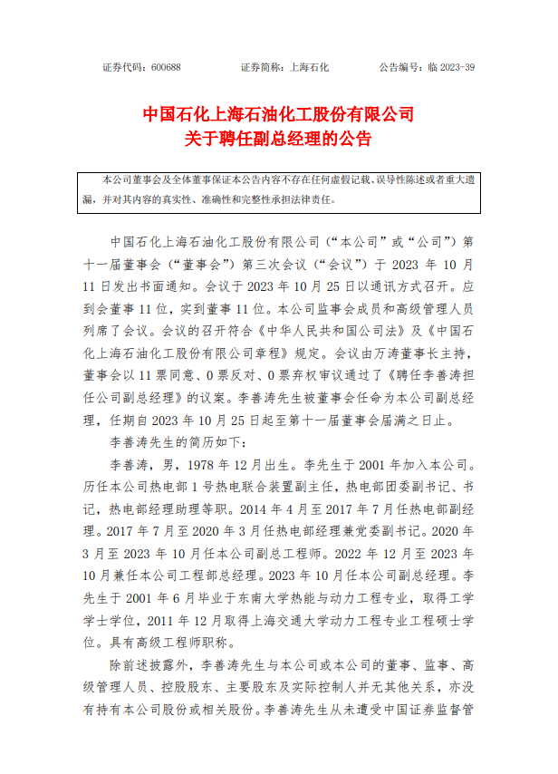 中国石化上海石油化工股份有限公司近日发布公告,聘任李善涛为该公司副总经理。