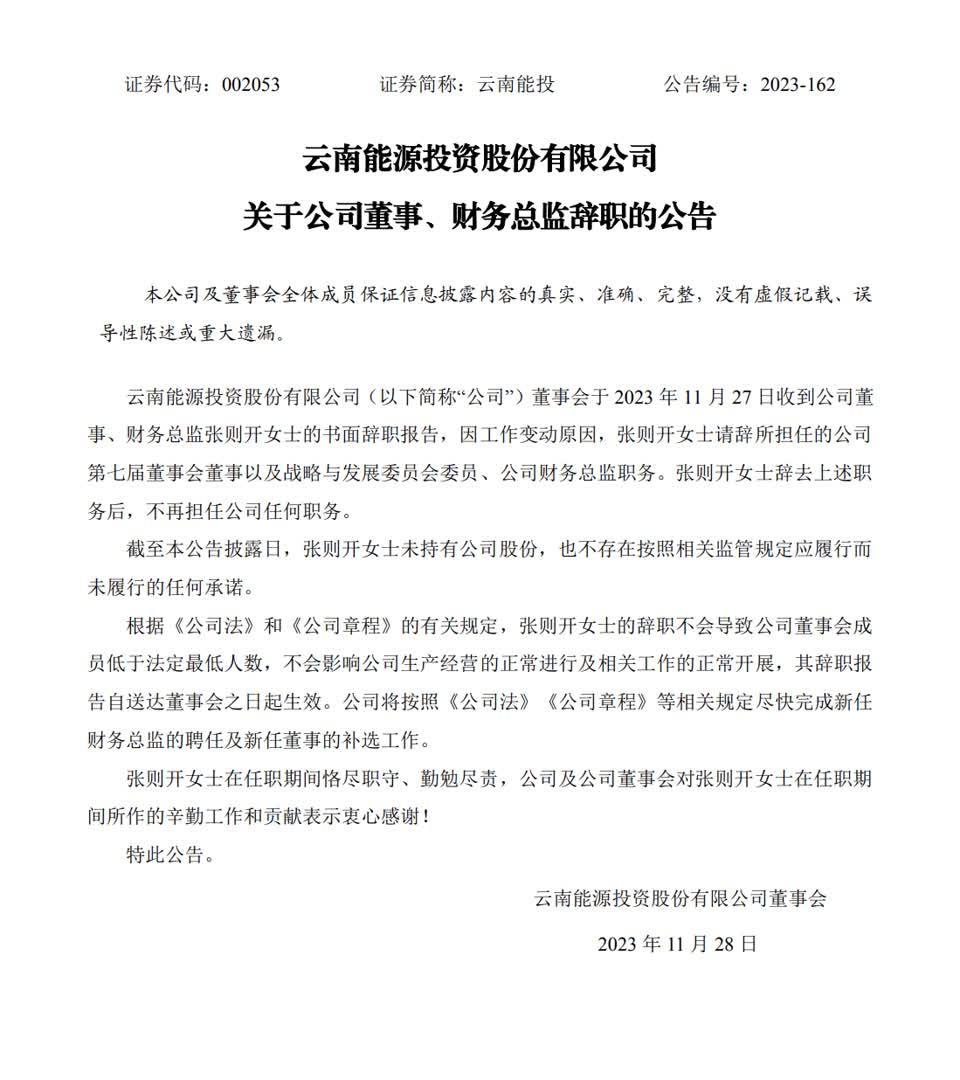 11月28日,云南能投发布《云南能源投资股份有限公司关于公司董事、财务总监辞职的公告》。