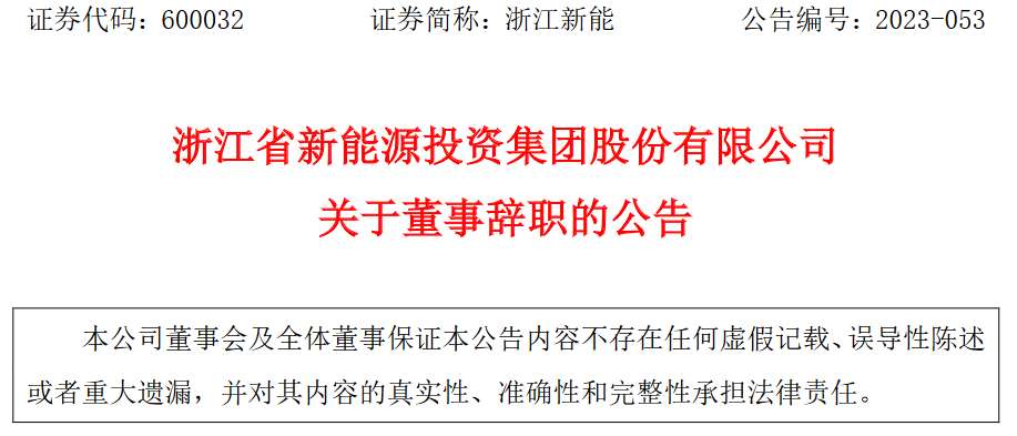 浙江新能于12月8日发布晚间公告称,浙江省新能源投资集团股份有限公司(以下简称“公司”)董事会于 2023 年 12 月 8 日收到公司董事骆红胜先生提交的书面辞职报告。因工作安排,骆红胜先生辞去公司董事及战略与决策委员会委员职务。辞职后,骆红胜先生不再担任公司任何职务。