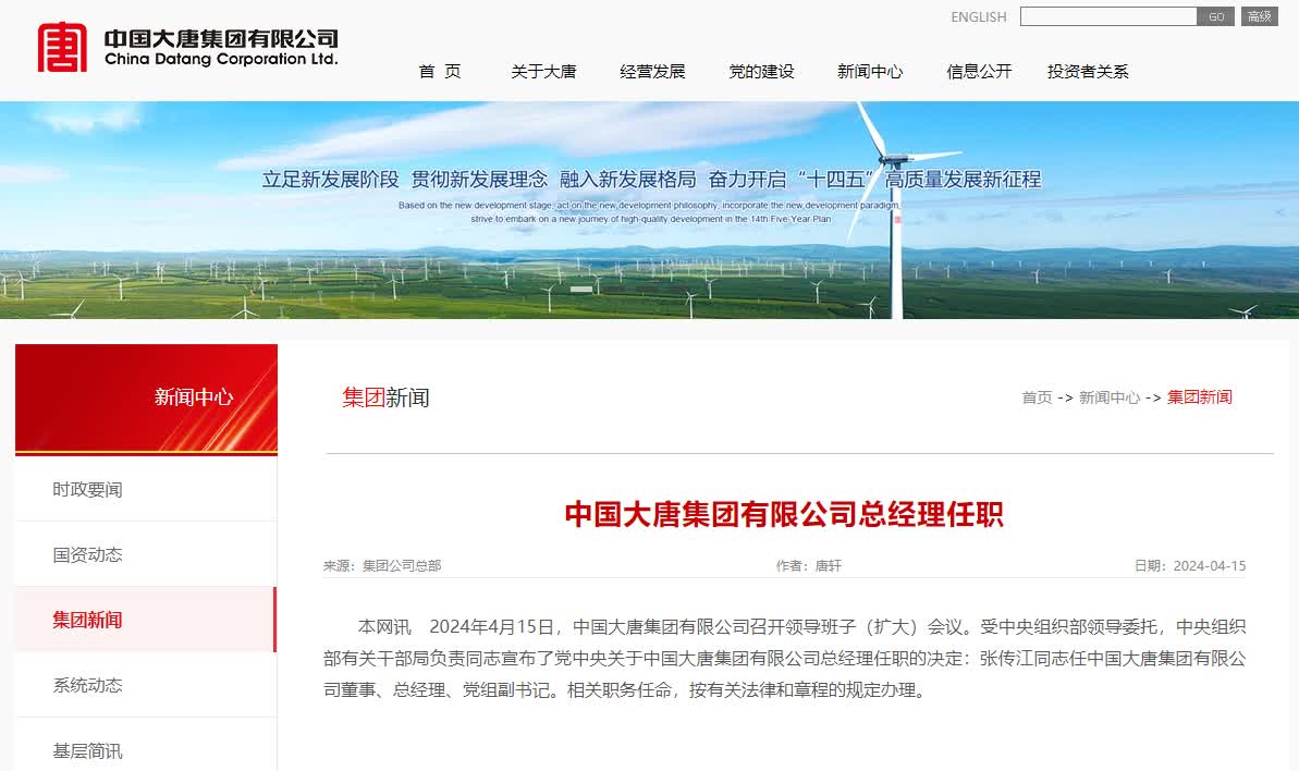 2024年4月15日,中国大唐集团有限公司召开领导班子(扩大)会议。受中央组织部领导委托,中央组织部有关干部局负责同志宣布了党中央关于中国大唐集团有限公司总经理任职的决定:张传江同志任中国大唐集团有限公司董事、总经理、党组副书记。相关职务任命,按有关法律和章程的规定办理。