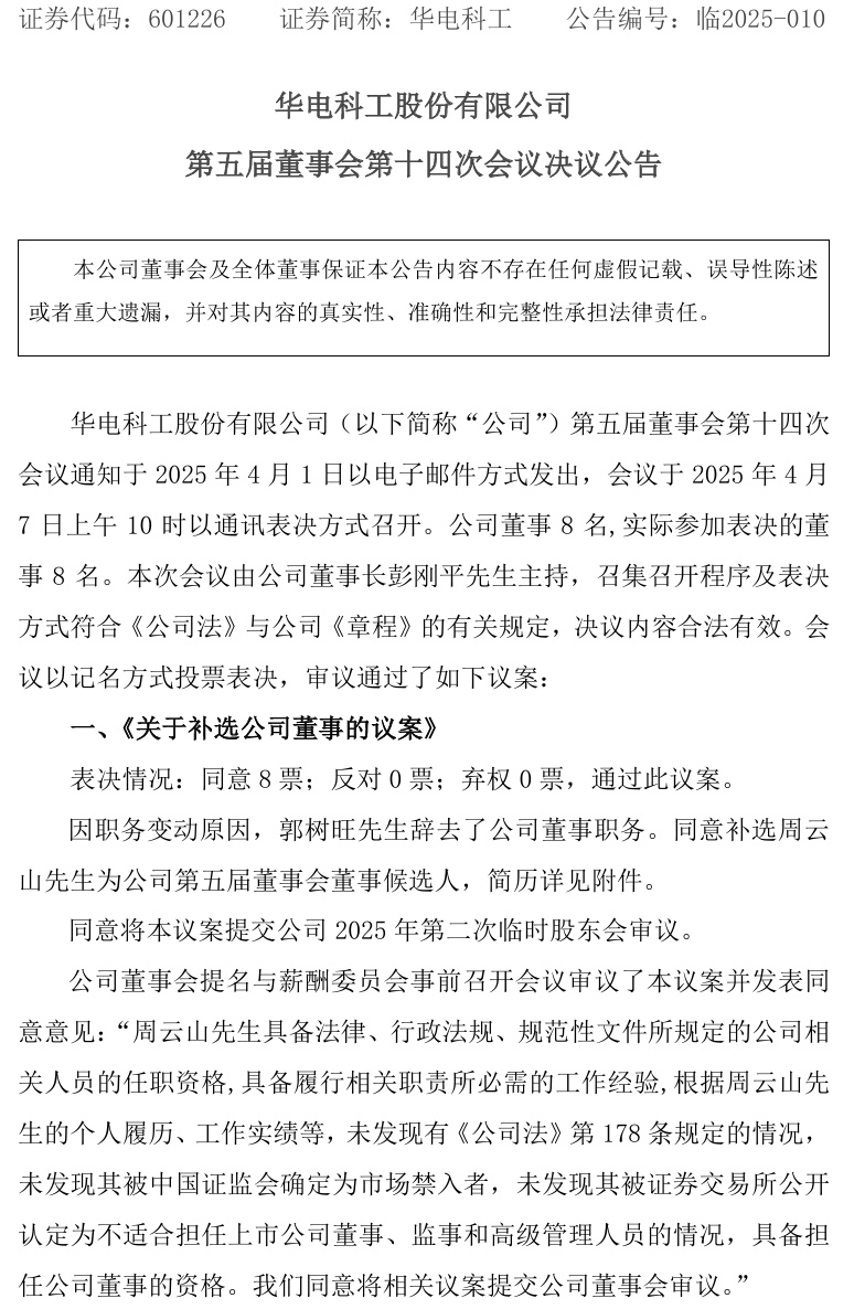 4月8日,华电科工发布公告,因职务变动原因,郭树旺先生辞去了公司董事职务。同意补选周云山先生为公司第五届董事会董事候选人。
