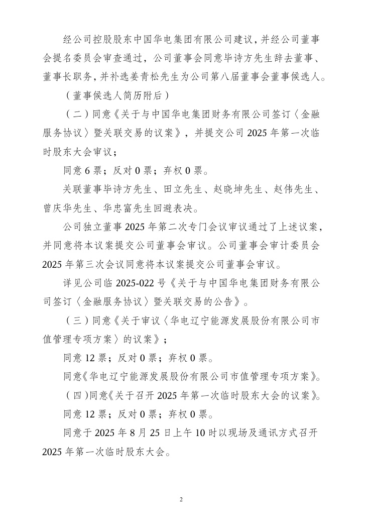 华电辽宁能源发展股份有限公司发布公告称,公司于8月8日召开第八届董事会第二十四次会议,同意《关于变更公司部分董事的议案》。经公司控股股东中国华电集团有限公司建议,并经公司董事会提名委员会审查通过,公司董事会同意毕诗方先生辞去董事、董事长职务,并补选姜青松先生为公司第八届董事会董事候选人。