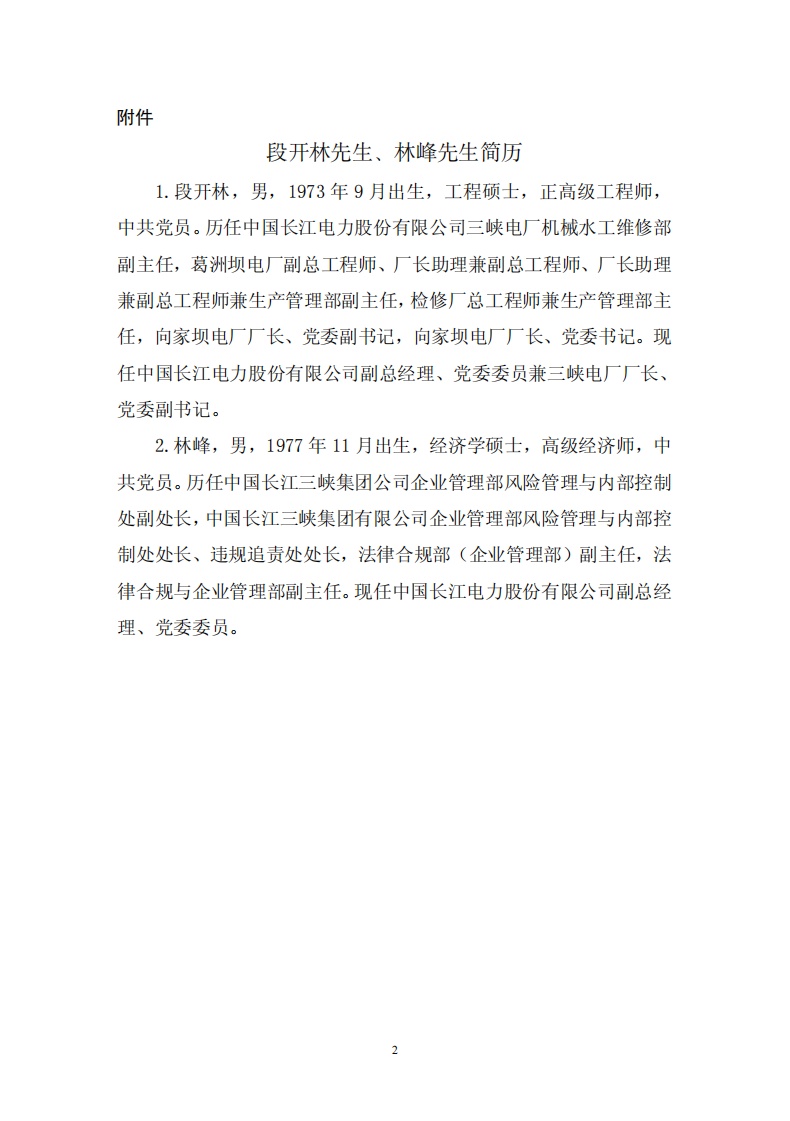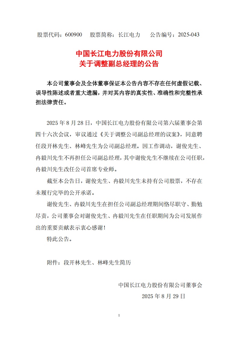 8月29日,长江电力发布公告称,8月28日,长江电力第六届董事会第四十六次会议,审议通过《关于调整公司副总经理的议案》,同意聘任段开林先生、林峰先生为公司副总经理。因工作调动,谢俊先生、冉毅川先生不再担任公司副总经理,其中谢俊先生不继续在公司任职,冉毅川先生改任公司首席专业师。截至本公告日,谢俊先生、冉毅川先生未持有公司股票,不存在未履行完毕的公开承诺。