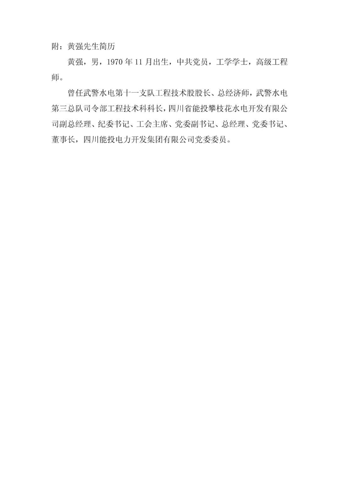 黄强,男,1970年11月出生,中共党员,工学学士,高级工程师。曾任武警水电第十一支队工程技术股股长、总经济师,武警水电第三总队司令部工程技术科科长,四川省能投攀枝花水电开发有限公司副总经理、纪委书记、工会主席、党委副书记、总经理、党委书记、董事长,四川能投电力开发集团有限公司党委委员。