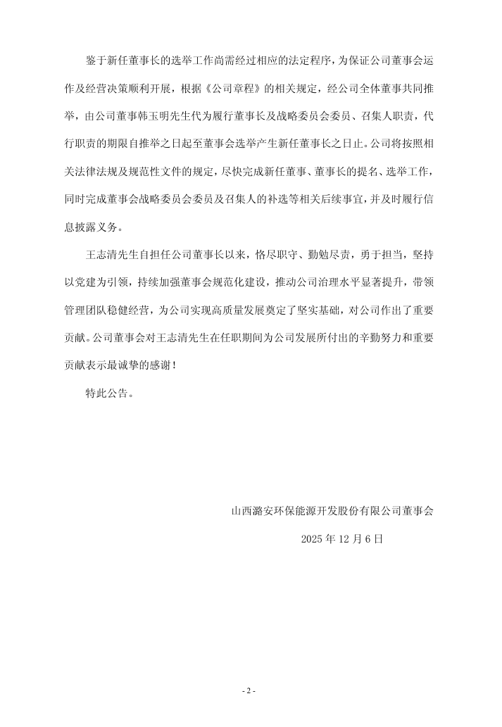王志清辞去山西潞安环保能源开发股份有限公司(以下简称“潞安环能”)董事长等职务。