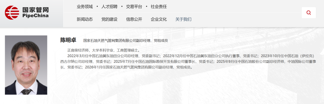 陈明卓,2022年3月任中国石油冀东油田分公司总经理、党委副书记;2022年12月任中国石油冀东油田分公司执行董事、党委书记;2023年10月任中国石油(伊拉克)西古尔纳公司总经理、党委书记;2025年7月任中国石油国际勘探开发有限公司董事长、党委书记;2025年9月任中国石油股份公司副总经济师,中油国际公司董事长、党委书记;2026年1月任国家石油天然气管网集团有限公司副总经理、党组成员。