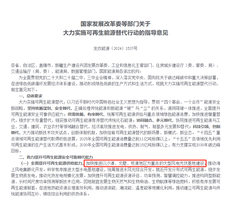同日晚间,国家发展改革委等六部门发布《关于大力实施可再生能源替代行动的指导意见》提到“加快推进以沙漠、戈壁、荒漠地区为重点的大型风电光伏基地建设”。