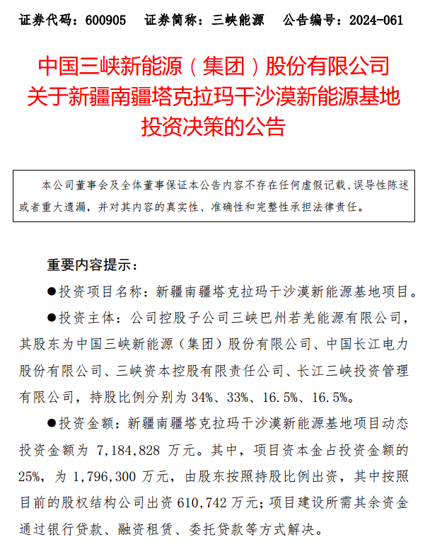 10月30日晚间,三峡能源公告称,公司与长江电力等公司拟通过子公司参与投建新疆南疆塔克拉玛干沙漠新能源基地项目(以下简称南疆基地项目),包含建设光伏850万千瓦、风电400万千瓦等,合计动态投资达718.48亿元。