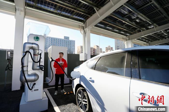 12月26日,北京姜庄湖智慧绿色超充港,车主体验全自动智能充电机器人。王紫儒摄