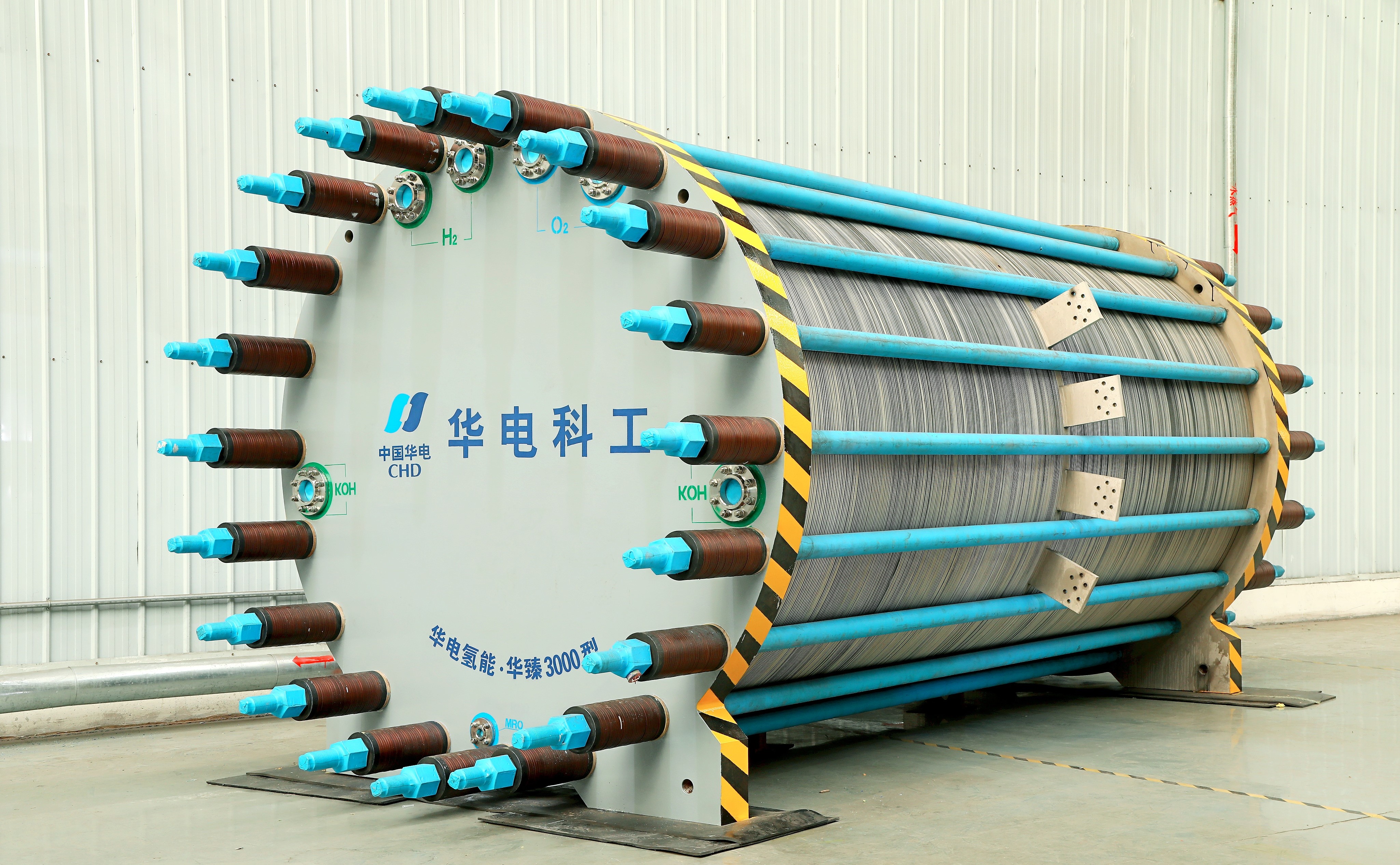 本次下线的“华臻”3300标立方/时碱性电解槽,由华电科工自主研发,具有高电流密度、高能源利用效率、高抗逆向电流特性。产品运行电流密度≥6000安/平方米,较常规千方级电解槽电流密度提升约100%,槽体重量较传统同规模电解槽减少约50%;电解槽负荷调节范围20%-110%,整体性能指标实现跨越式提升。