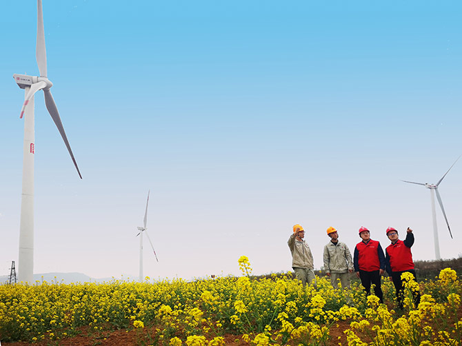 电力员工在红石山风电场协助开展设备安全检查。李闯摄