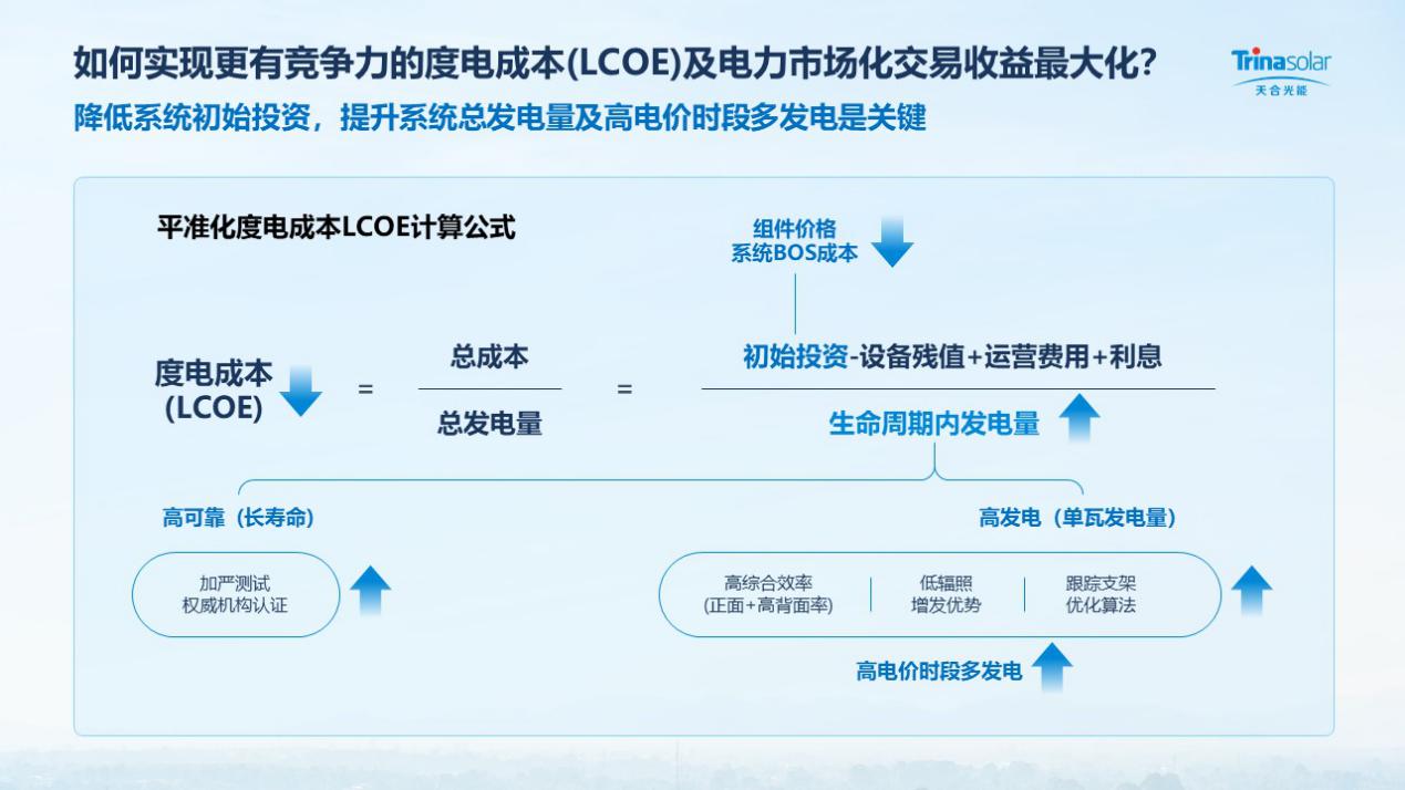 张映斌指出,实现更具竞争力平准化度电成本,关键是要降低系统初始投资,同时提升系统综合发电能量及高电价时段发电量。天合光能大基地解决方案凭借更高效i-TOPCon Ultra组件、单位面积更高功率、串功率更高来降低设备与建设成本、系统初始投资;通过低辐照增发优势、高综合效率的组件搭配跟踪支架优化算法来实现高电价时段多发电以及生命周期内更多发电量,最终实现更低度电成本。而更低的度电成本意味着更多的收益。