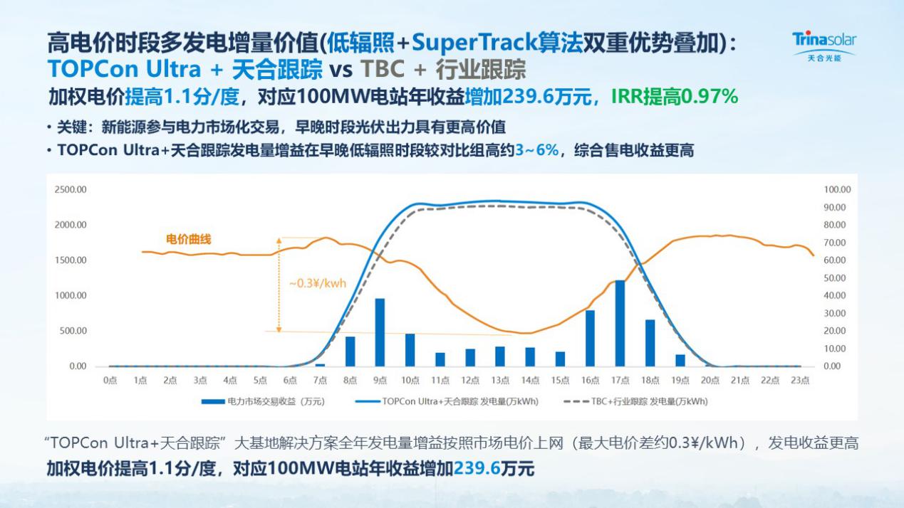 随着新能源参与电力市场化交易深入,天合光能大基地产品解决方案一方面得益于i-TOPCon Ultra组件优异的低辐照性能,在早晚可比BC增发5%-10%;另一方面,天合1P跟踪支架更可以依据智能算法早晚灵活调节角度,在电价更高的早晚时段提升10%发电量,使每度电加权售价提高至少1.1分/千瓦时。天合光能大基地解决方案可为100兆瓦电站年收益增加239.6万元,内部收益率提高0.97%。
