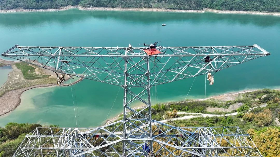 ▲金上—湖北±800千伏特高压直流输电工程跨江作业现场