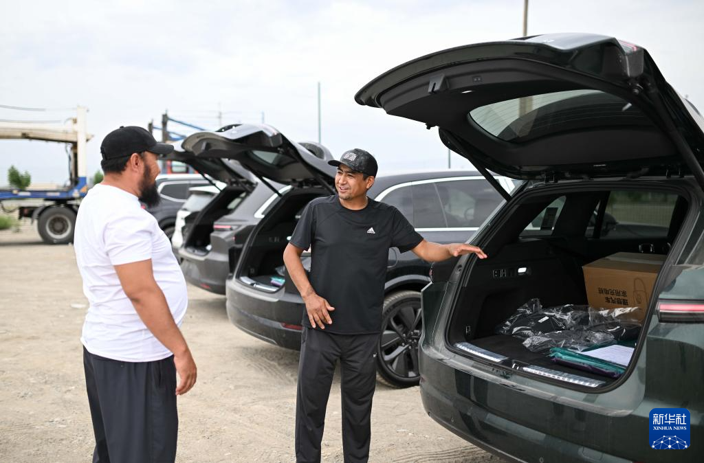 5月22日,运输公司的工作人员驾驶从中国进口的新能源汽车驶向哈萨克斯坦扎尔肯特镇的中转停车场。新华社记者李任滋摄