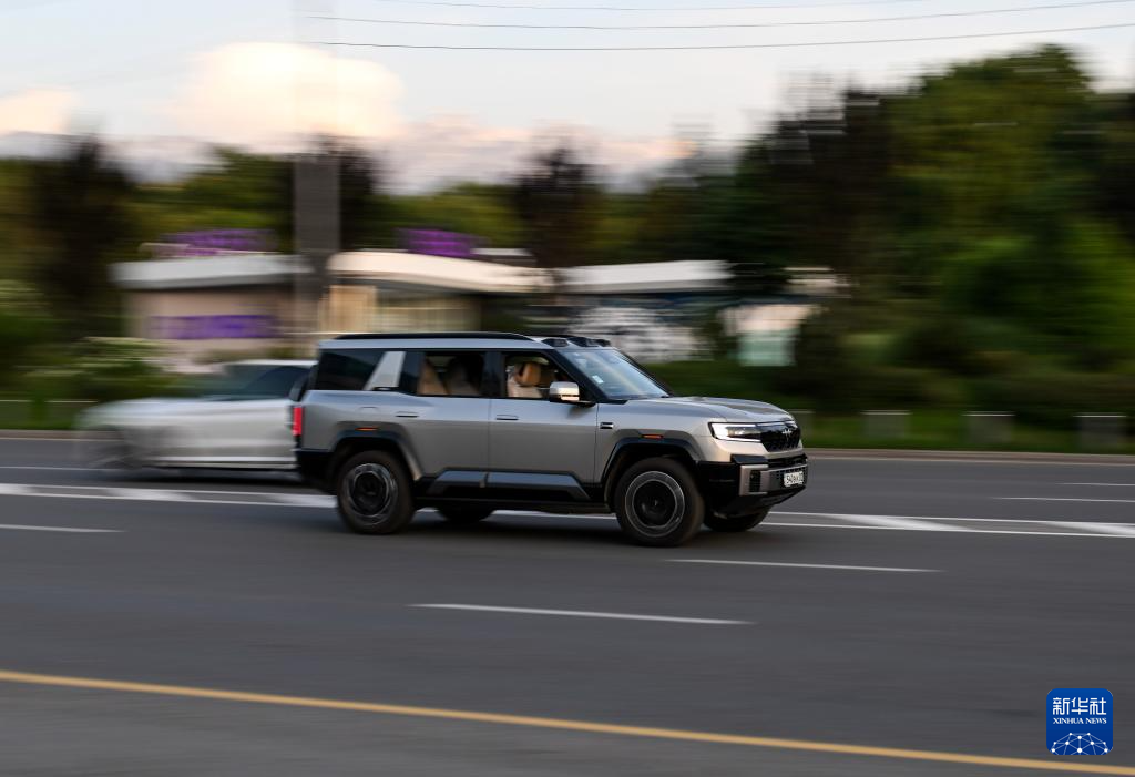 5月15日,一辆中国品牌新能源汽车行驶在哈萨克斯坦阿拉木图市区。新华社记者李任滋摄