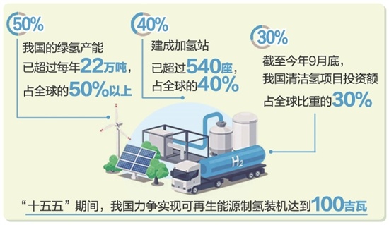 当前我国氢能产业快速发展,多项技术指标居于全球首位。目前,我国的绿氢年产能已超过22万吨,占全球的50%以上;建成的加氢站已超过540座,占全球的40%。数据显示,截至今年9月底,我国清洁氢项目投资额占全球比重的30%,居全球首位。