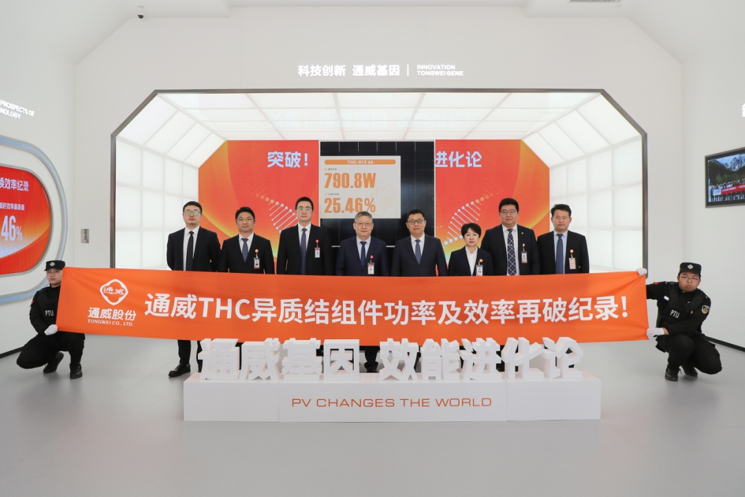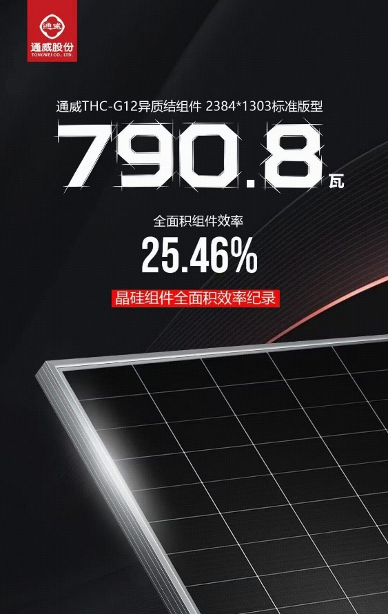 HJT技术方面,经国际权威认证机构TüV测试,通威2384*1303mm标准组件尺寸THC-G12异质结组件最高功率达到790.8W,全面积组件效率达到25.46%,创权威第三方测试晶硅组件全面积效率的最高值。