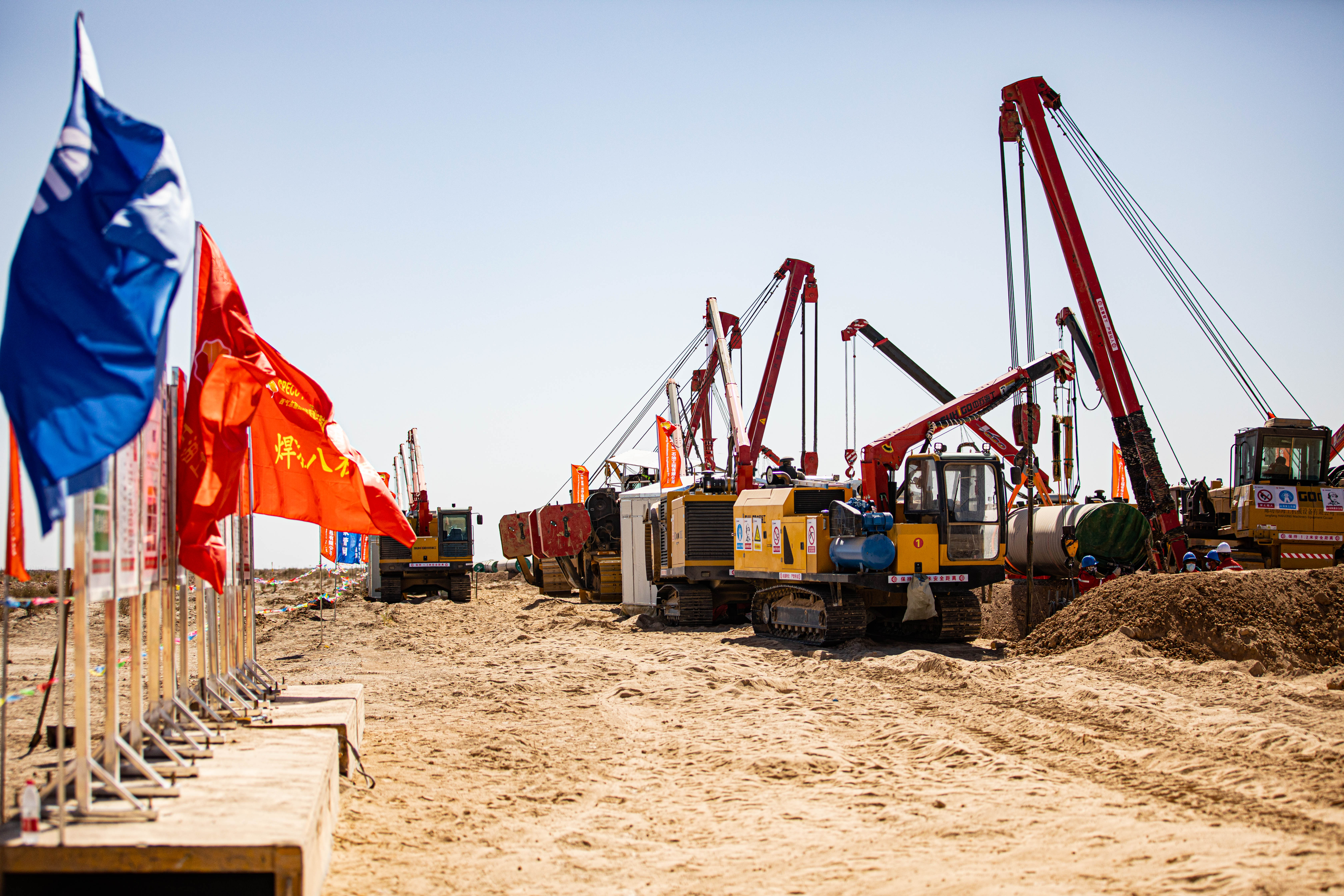 西气东输四线(吐鲁番—中卫)新疆段沿线以戈壁、荒漠为主,人烟稀少,交通不便,社会依托较差。管道穿越火焰山下的吐鲁番市高昌区和鄯善县,夏季温度最高达47.8摄氏度;途径“百里风区”,一年中8级以上大风天气近140天,局部地段阵风超过12级。此外,管道与已建的西部原油管道、西部成品油管道、西气东输二线、西气东输三线4条管道并行敷设,部分管段穿越地形起伏较大的雅丹地貌区,所经石方段等级高,管沟开挖难度极大。