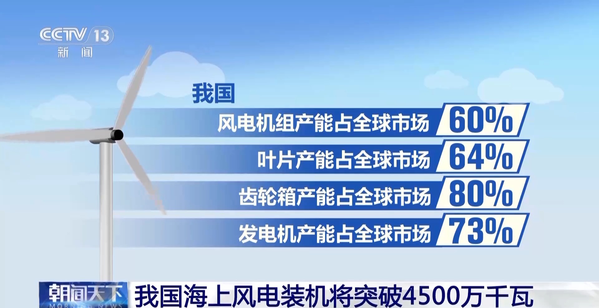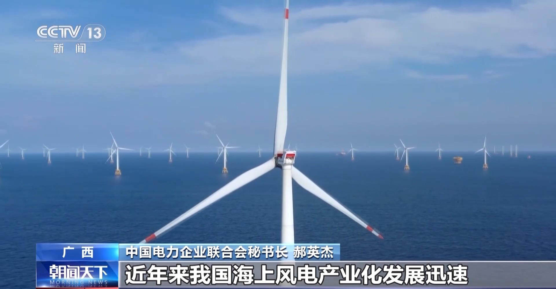 中国电力企业联合会秘书长 郝英杰:近年来,我国海上风电产业化发展迅速,目前我国海上风电机组最大单机容量达到20兆瓦级,累计装机容量从2018年的不到500万千瓦,到今年底有望突破4500万千瓦,将连续四年位居全球首位。