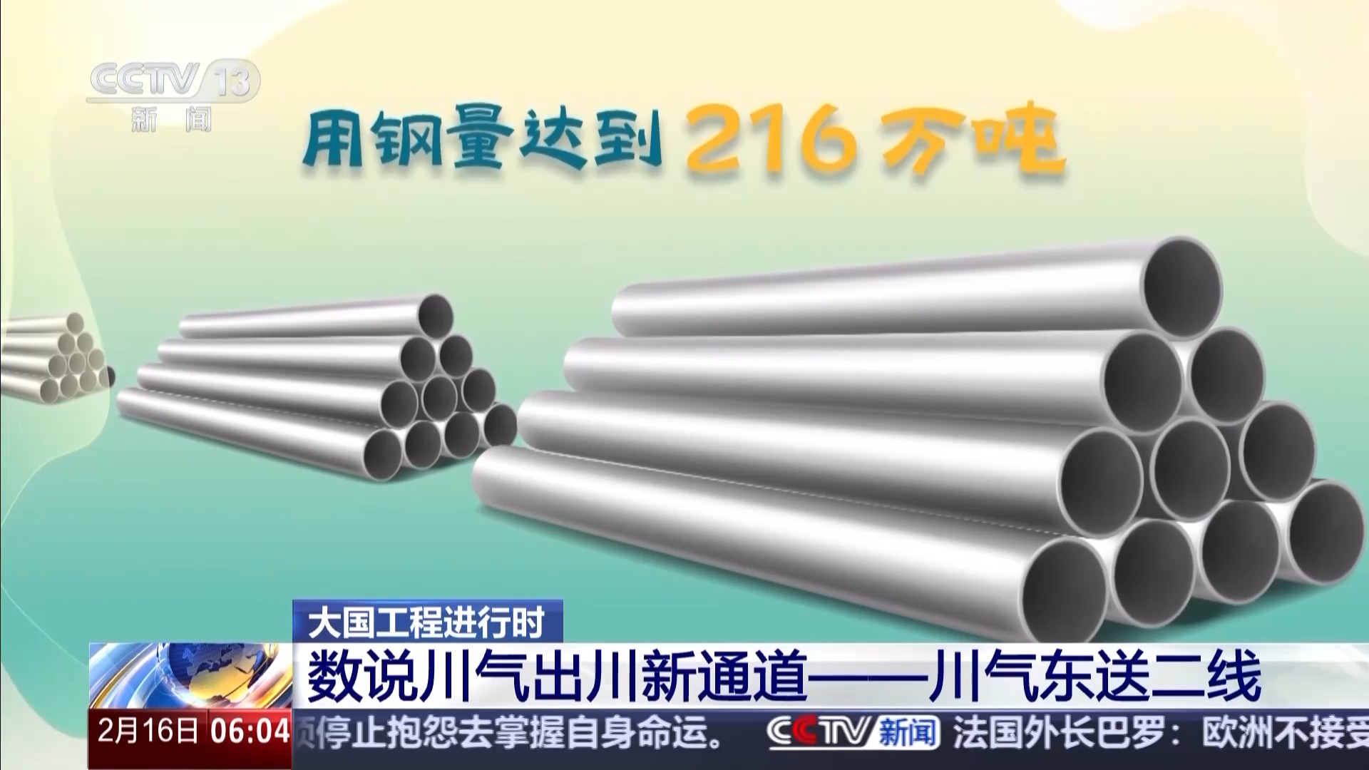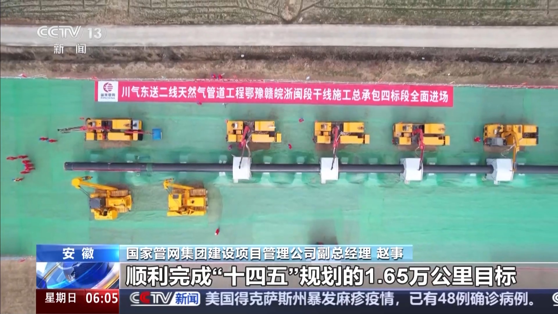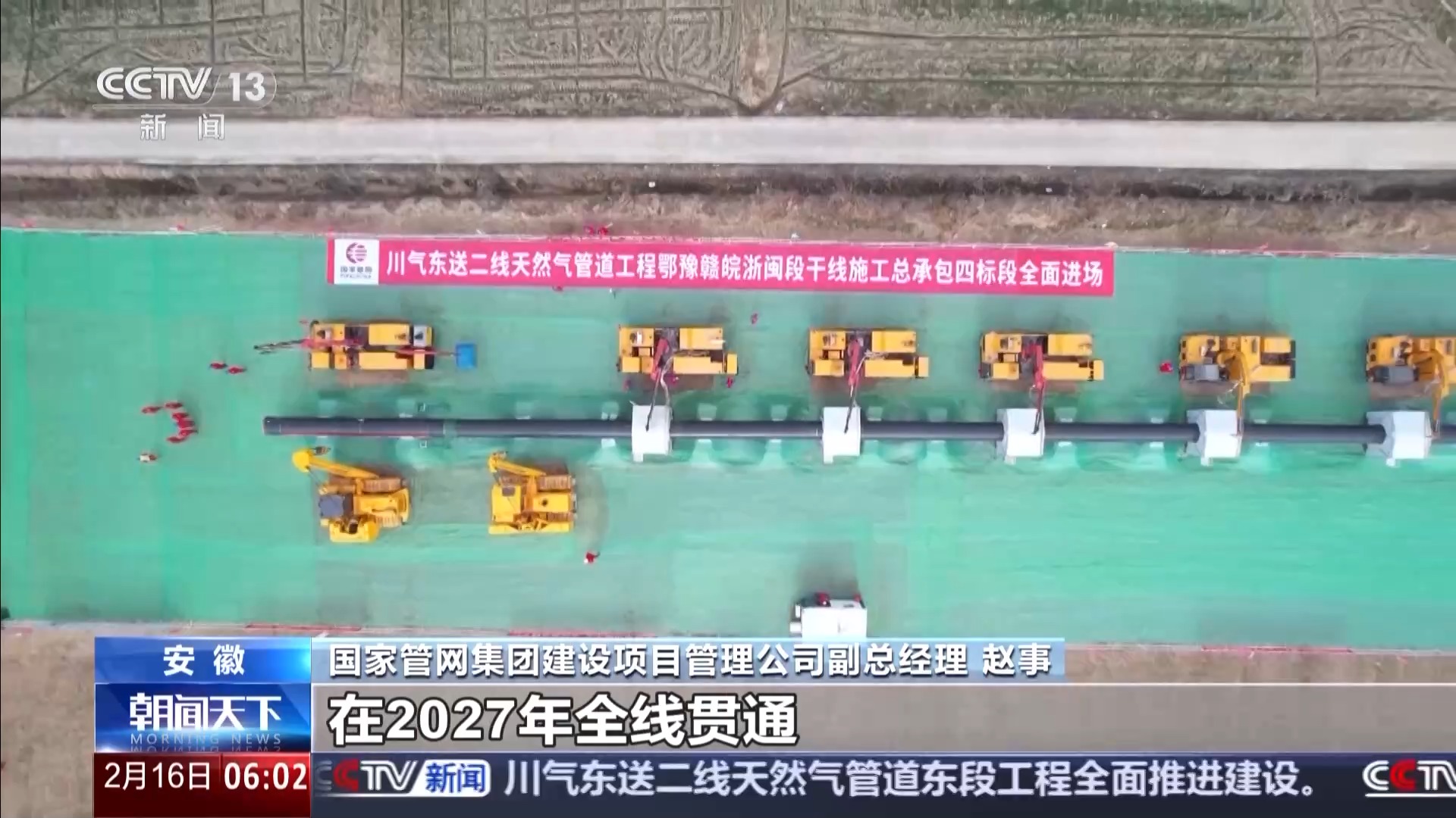 国家管网集团建设项目管理公司副总经理 赵事:西段工程是在2023年开工建设,目前正在全力推动建设的是东段工程。西段工程截止到目前,威远到铜梁段已经完成焊接220公里,综合进度超70%,预计川气东送二线整个工程在2027年全线贯通。