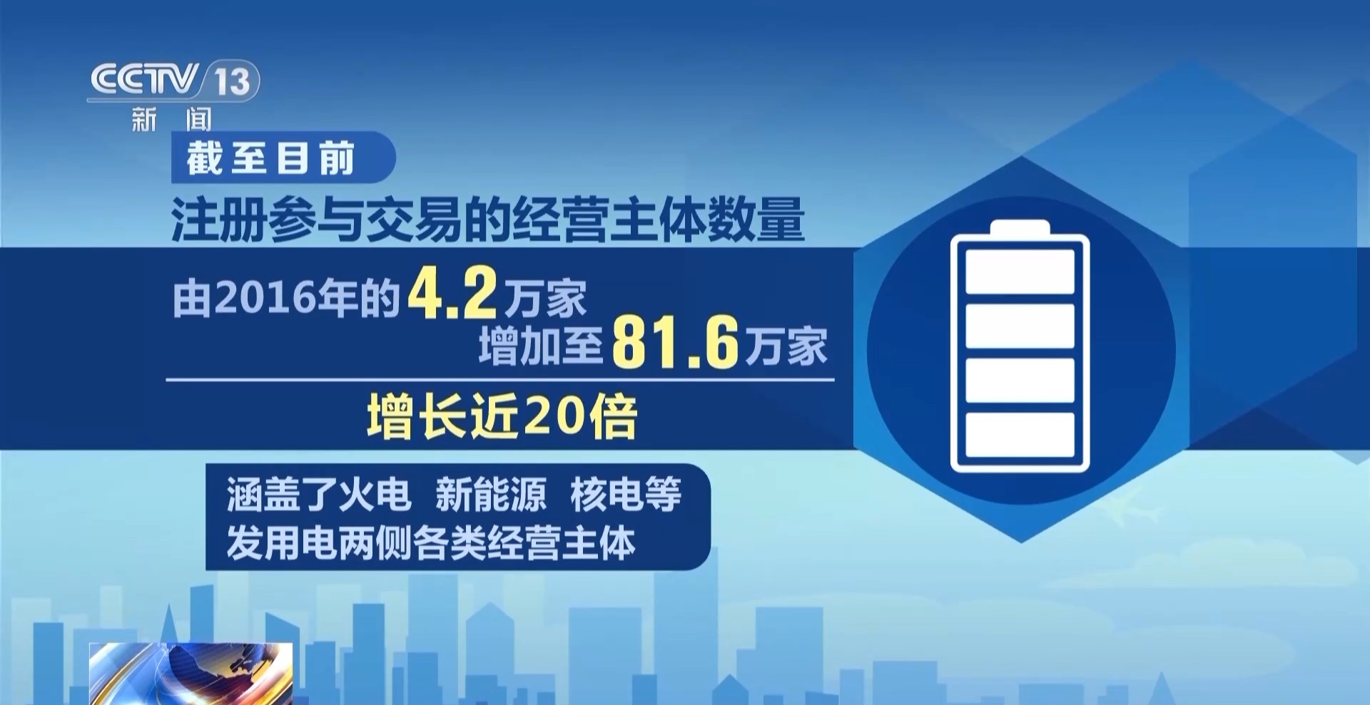从参与市场化交易的主体来看,截至目前,注册参与交易的经营主体数量由2016年的4.2万家增加至81.6万家,增长近20倍,涵盖了火电、新能源、核电等发用电两侧各类经营主体。