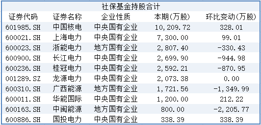 在社保基金的一季度持仓布局中,电力板块共10只个股上榜,最新持仓市值合计84.35亿元,其中8只持股总量超千万。