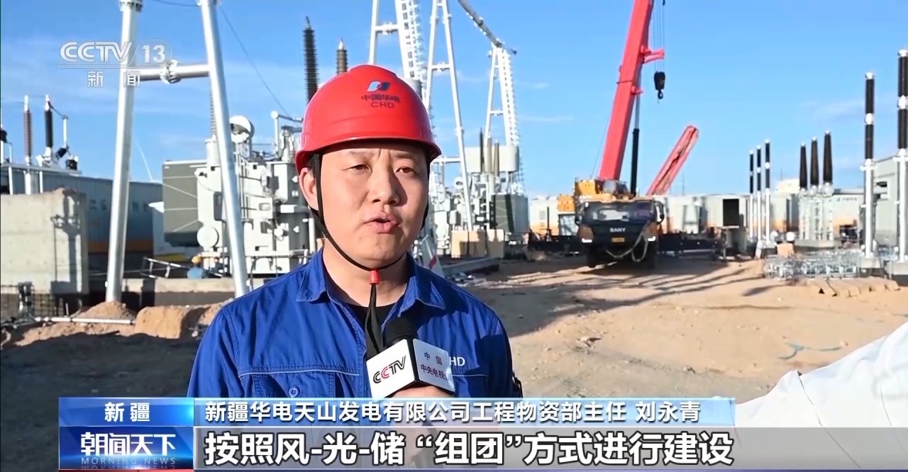 新疆华电天山发电有限公司工程物资部主任 刘永青:项目采用风光同场布置,按风-光-储“组团”方式建设,同步建设8座220KV汇集站,是国内首个“风光火储”一体化运行控制新能源项目。
