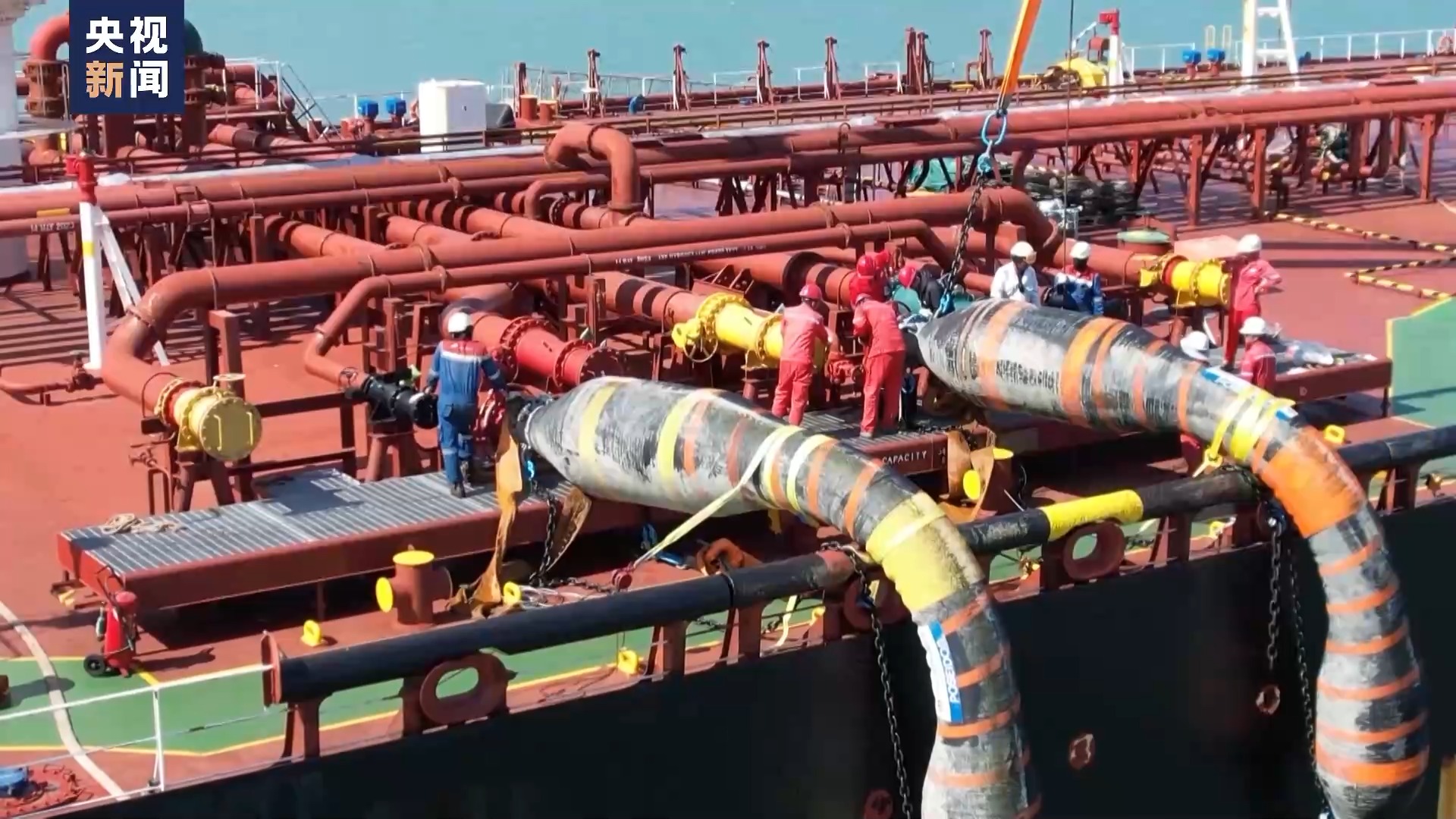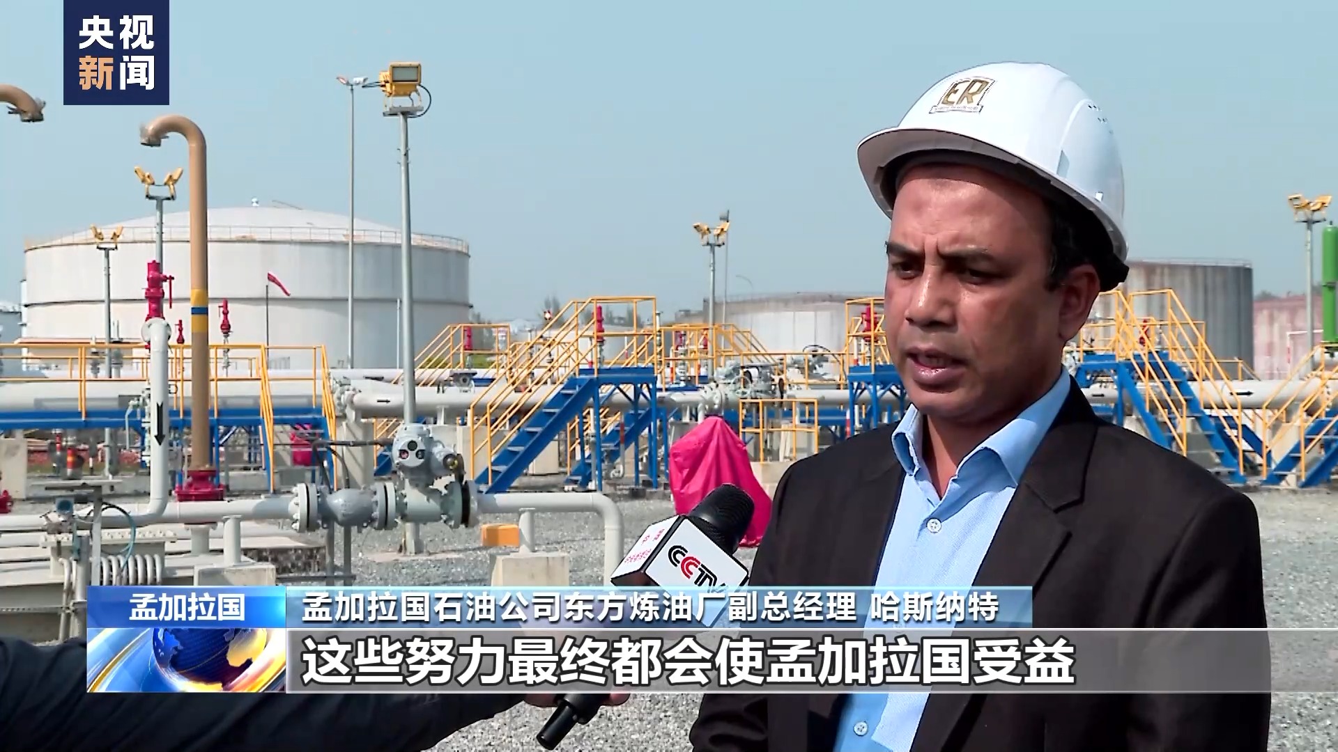 央视总台记者 王建兵:我身后就是孟加拉国唯一的炼油厂东方炼油厂。旁边这条白色的管道就是220公里长,由中国企业修建的海陆原油输油管道。这个管道可以将海上巨大油轮上的原油源源不断的直接运送到炼油厂,不仅可以大幅减少原油运输的成本,而且也可以提升工厂的炼油能力。