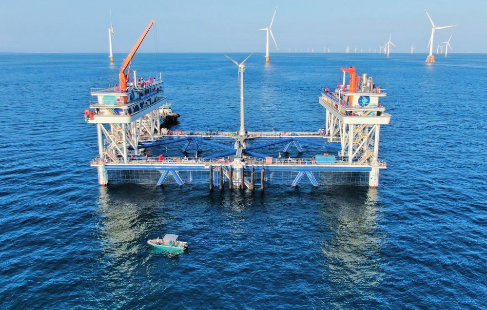 中广核“伏羲一号”是全部依靠绿色能源供能的大型风渔融合网箱平台,项目对于我国“海上风电+海洋牧场”产业融合发展具有重要示范意义。图为中广核“伏羲一号”风渔融合网箱平台(2024年9月2日摄)邓华摄