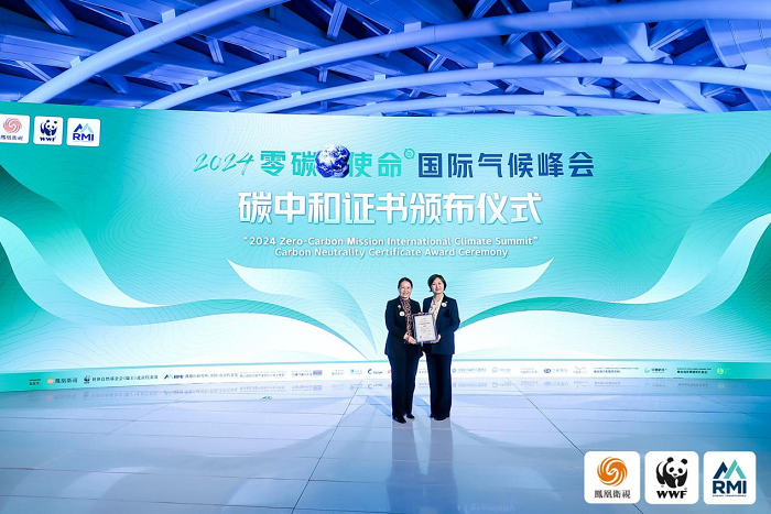 在本届峰会闭幕环节上,凤凰卫视品牌及公共事务副总裁兼品牌中心总经理高雁、中碳科技(湖北)有限公司总经理沈双波出席了“2024 零碳使命国际气候峰会”碳中和证书颁布仪式。中碳科技对此次峰会的碳中和进行评估,并向此次会议颁发碳中和证书。经过科学测算,本次峰会总碳排放额1.56吨。为了践行真正的碳中和使命,凤凰卫视决定采购2吨的CCER进行抵消。