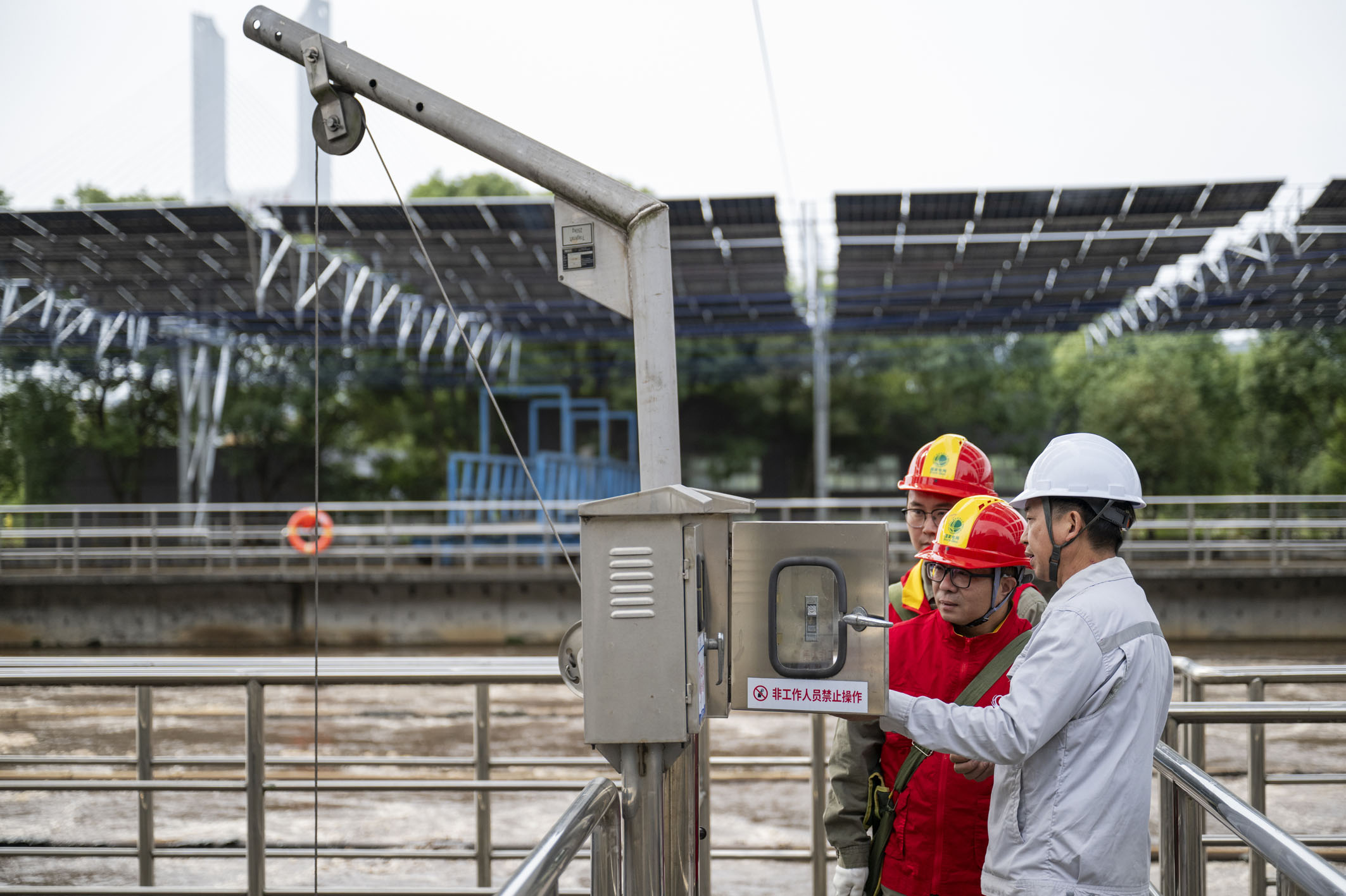 近年来,南水北调中线核心水源区湖北省十堰市充分利用原有的资源禀赋和产业基础,加快绿色低碳转型。图为工作人员检查污水处理厂生化池设备运行情况。新华社记者 伍志尊 摄