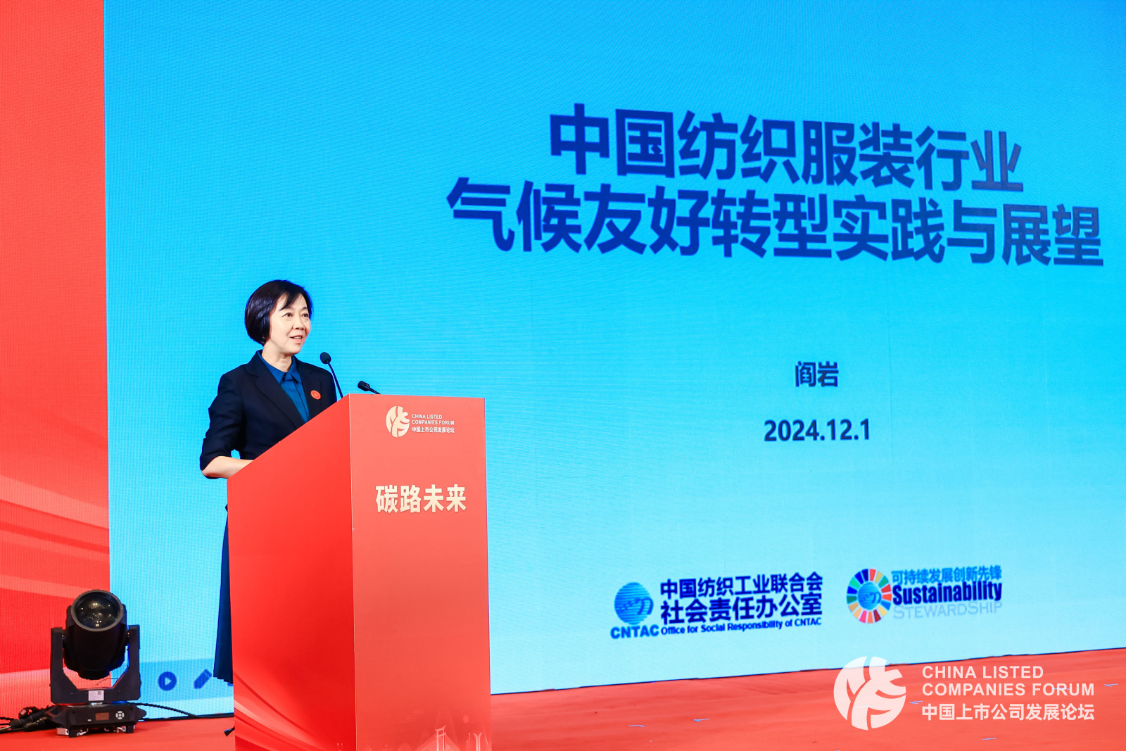 中国纺织工业联合会副会长阎岩作题为《中国纺织服装行业气候友好转型实践与展望》的主旨演讲